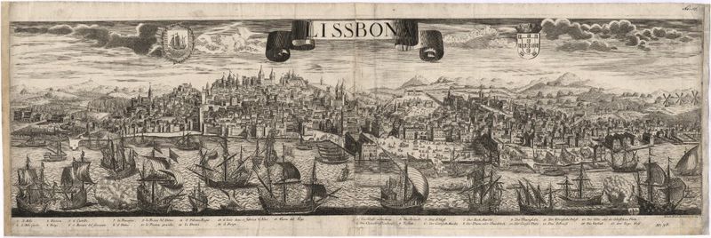 É uma vista panorâmica da Cidade de Lisboa, mostra pontos altos da cidade e arredores com o brasão de armas de Portugal ao lado do título, inserido numa bandeirola; a cidade é retratada a partir do rio Tejo, mostrando os barcos em 1{u00BA} plano.
