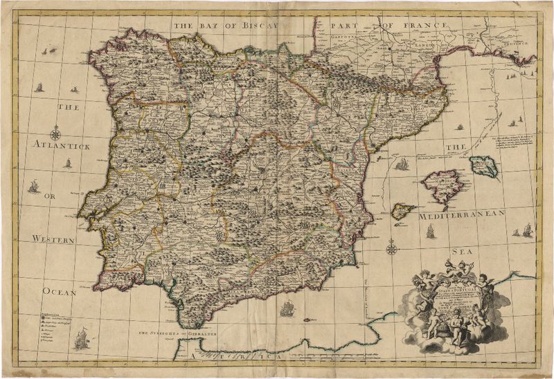 A correct map of Spain & Portugal : according to the newest observations and discoveries comunicated to the Royal Society at London and the Royal Academy at Paris is humbly dedicated to the Right Honorable Iohn Ld. Somers Baron of Evesham