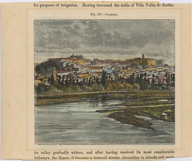 Representa a cidade de Coimbra vista da margem sul, no verso texto em inglês que descreve a cidade e arredores.