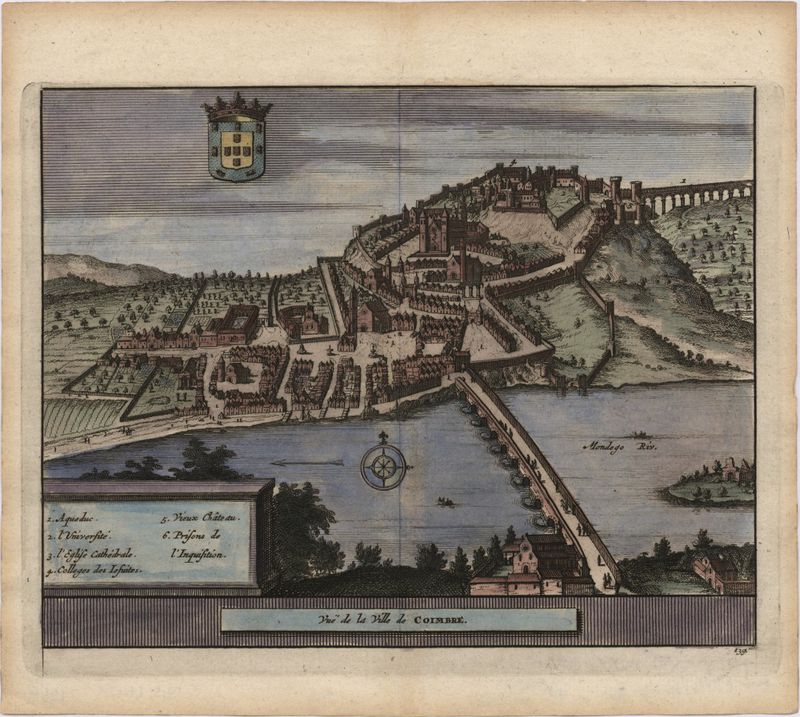 Tem legenda de 6 lugares, vista da margem esquerda da cidade, ponte a atravessar o rio Mondego, ilhota no meio do rio e algumas edificações da margem direita.