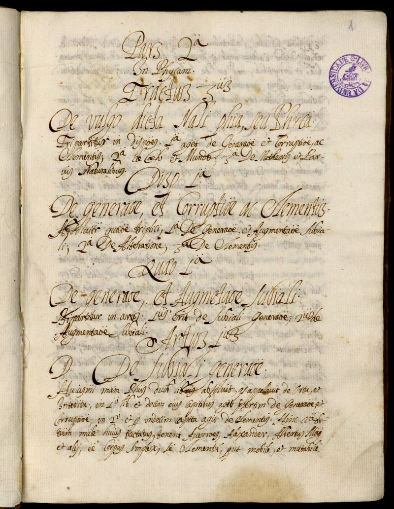 Pars [secund]a: In Phy[si]cam: Tract[at]us [terti]us: De vulgo dicta Na[tura]li phi[losophi]a, seu Phy[si]ca (f. 1); Disp[utatio] [prim]a: De genera[ti]o[n]e, et Corruptio[n]e ac elementis (f. 1); Disp[utatio] [secund]a: De Caelo et Mundo (f. 40); Disp[u
