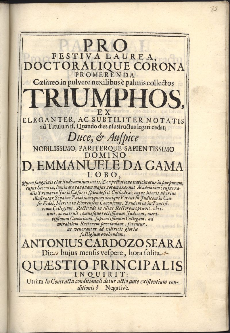 Pro festiva laurea, doctoralique corona promerenda caesareo in pulvere nexilibus è palmis collectos triumphos : ex eleganter, ac subtiliter notatis ad titulum ff. Quando dies ususfructus legati cedat : quæstio principalis inquirit : utrum in contractu conditionali detur actio ante existentiam conditionis? Negativè / duce et auspice ... Emmanuele da Gama Lobo ...; Antonius Cardozo Seara die 29 hujus mensis vespere, hora solita 4