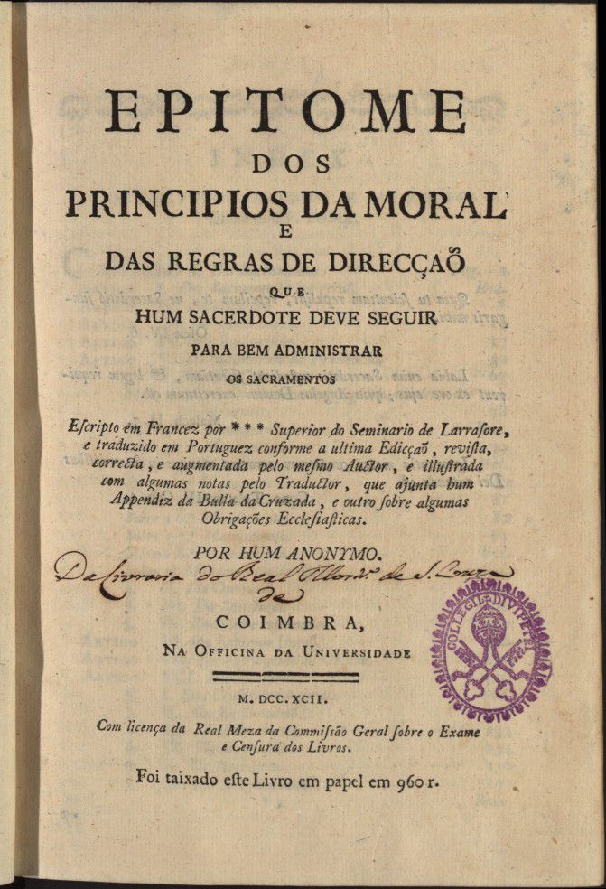 Erro de foliação não afectando a contagem, p. [187] erradamente numerada 287. - Manchas de acidez e humidade. - Pert.: "Da Livraria do Real Most.ro de S.Cruz de Coimbra"; Real Colegio de S. Pedro. - Enc. em pele com filete simples grav. a ferros secos, com lombada com duplo filete e rótulo com o titulo, grav. a ferros dourados.