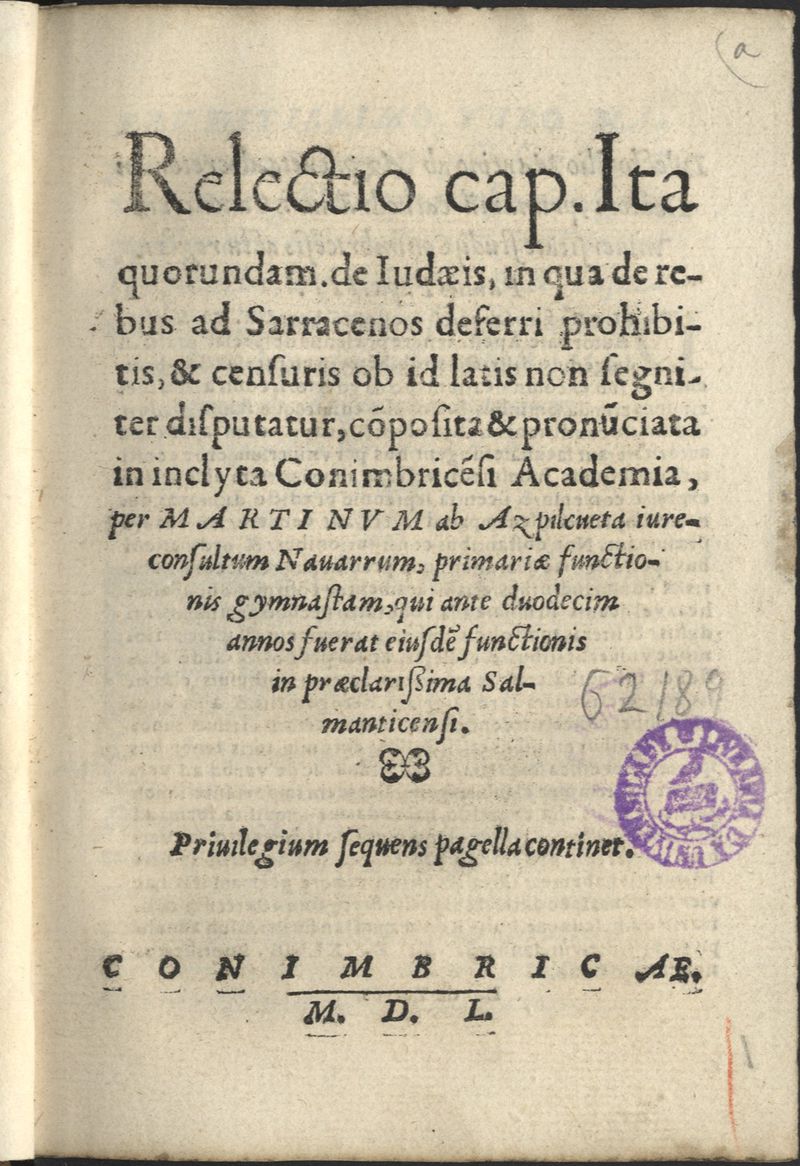 Aparado. - Manchas de humidade e picos de insectos. - Notas mss. - Enc. com: Relectio in Leuitico.../Martim de Azpilcueta Navarro. - Enc. em pele com lombada grav. a ferros dourados.