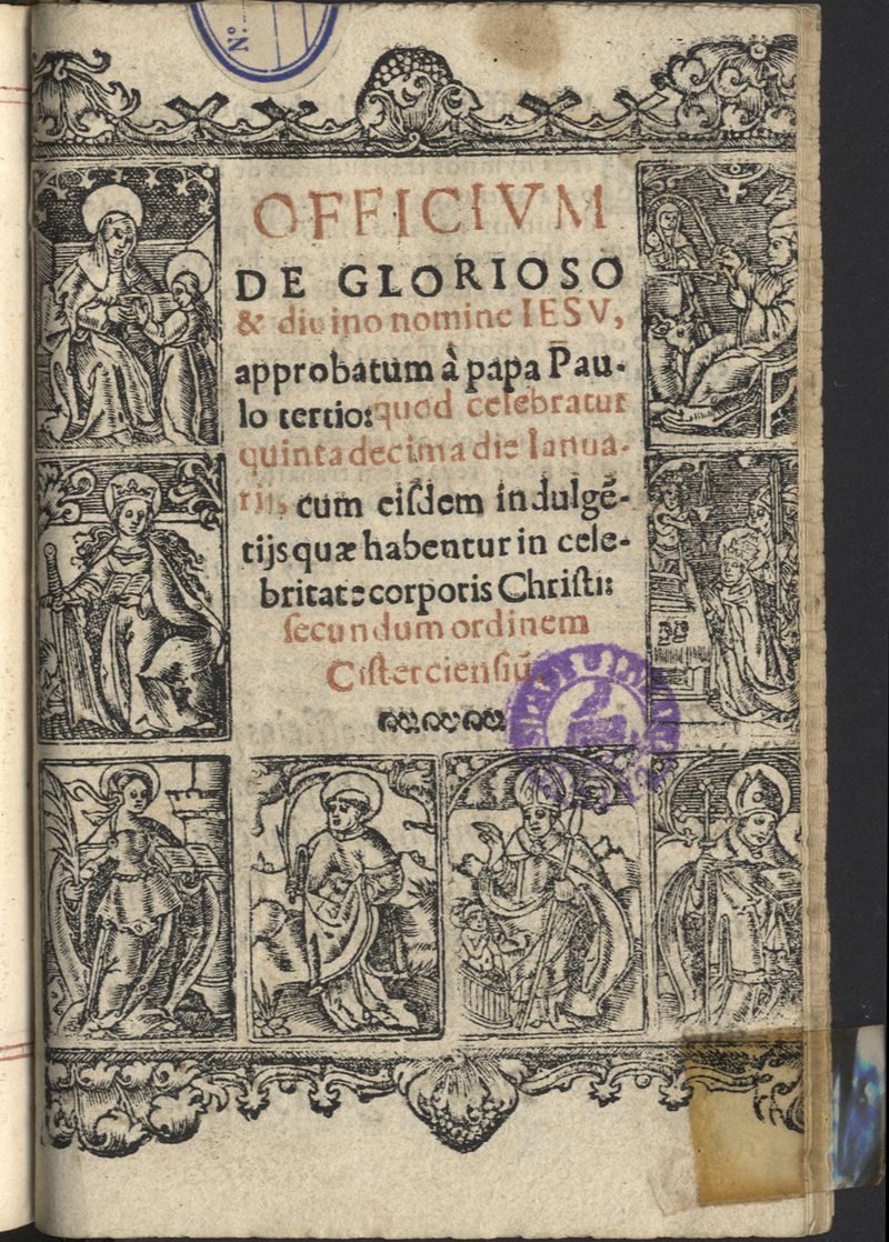 Officium De Glorioso & divino nomine Iesu, approbatum à papa Paulo tertio quod celebratur quinta decima die Ianuarii, cum eisdem indulge[n]tijs quae habentur in celebritate corporis Christi Secundum Ordinem Cisterciensiu[m]