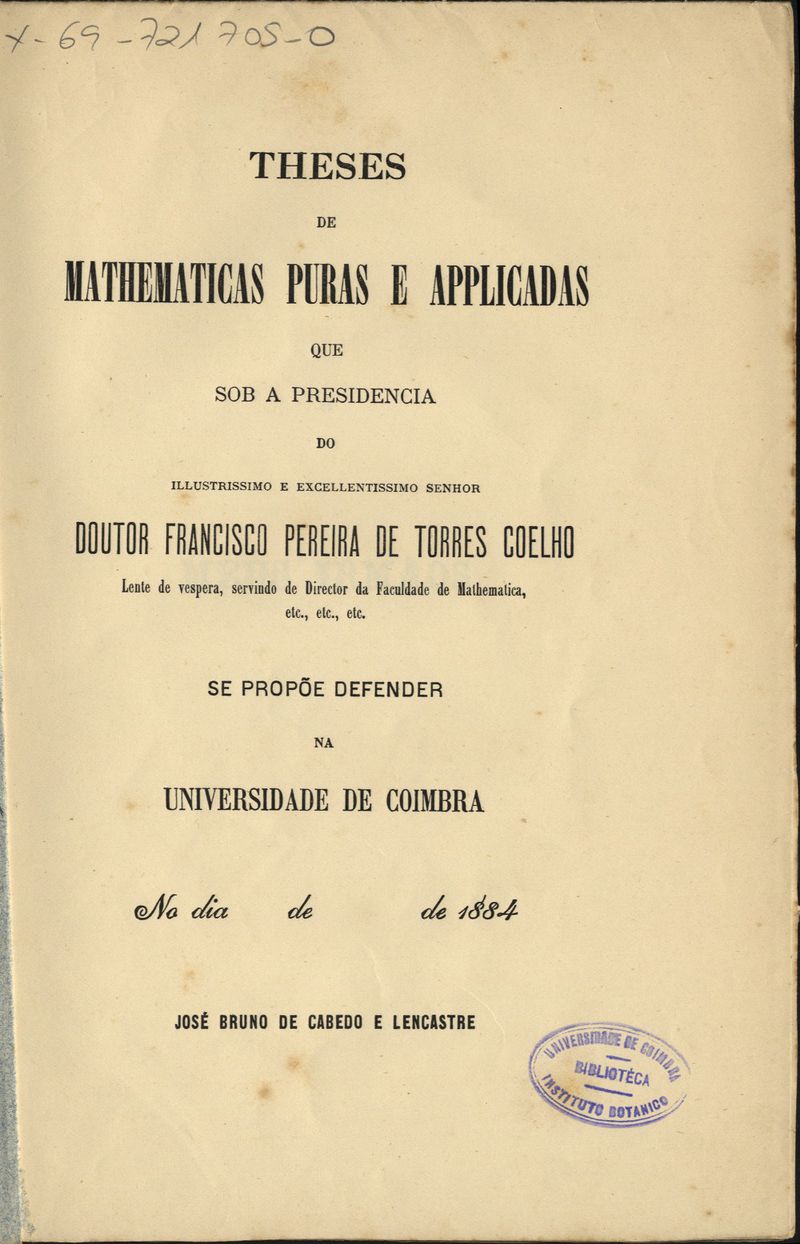 Theses de mathematicas puras e applicadas que sob a presidencia do... Doutor Francisco Pereira de Torres Coelho... se propõe defender na Universidade de Coimbra... José Bruno de Cabedo e Lencastre