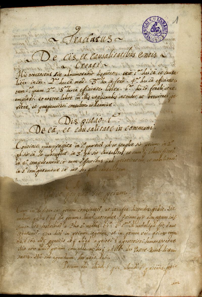 Disputa[ti]o [prima], De c[aus]a et causalitate in communi (f. 1) ; Disputatio [secunda], De causa materiali (f. 11) ; Disp[utatio] [tercia], De c[aus]a f[o]r[ma]li (f. 28 v.) ; Disp[utatio] [quarta], De c[aus]a efficiente tam [prim]a quam [secund]a (f. 44 v.) ; Disputa[ti]o [quint]a, De c[aus]a efficiente libera (f. 68) ; Disputa[ti]o [sext]a, De causa finali et exemplari (f. 88 v.).