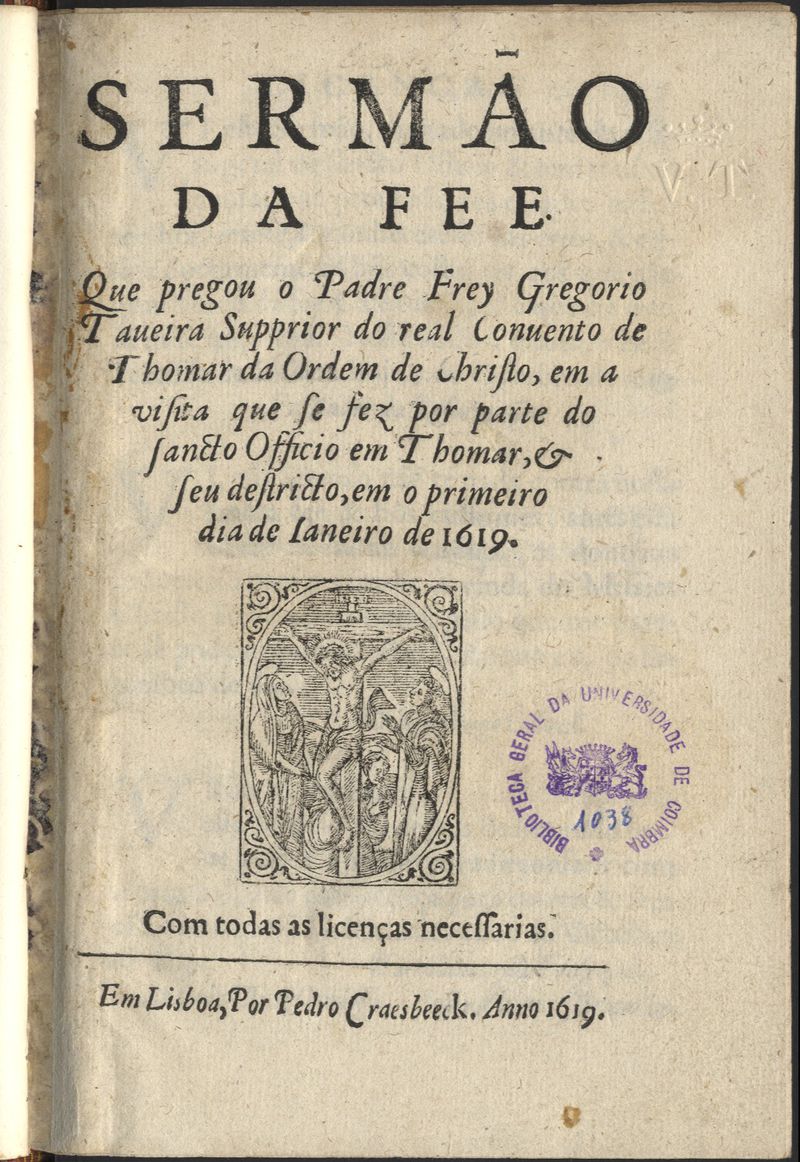 Sermão da fé que pregou o Padre Frei Gregório Taveira ... em a visita que se fez por parte do Santo Ofício em Tomar, e seu distrito, em o primeiro dia de Janeiro de 1619