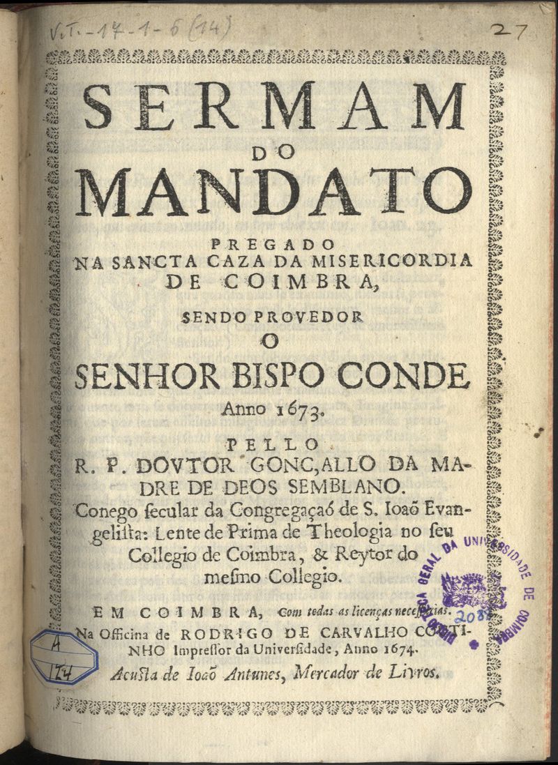 Em Coimbra : Na officina de Rodrigo de Carvalho Coutinho : acusta [sic] de Ioaõ Antunes, mercador de livros, 1674