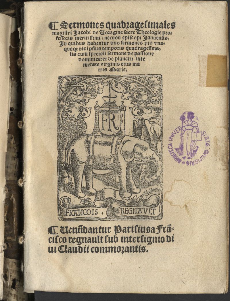 F. com a assin. R//8 em branco. - Manchas de humidade. - Enc. com: Sermones aurei de pulcherrimi variis scripturaru[m] doctrinis referti de te[m]pore ... Jacobo de Voragine; Sermones pulcherrimi bariis scripturarum doctrinis referti de sanctis per anni totius circulum concurrentibus ... Jacobo de Voragine - Enc. com pastas de madeira revestidas a pele com fechos de metal em mau estado de conservacao.