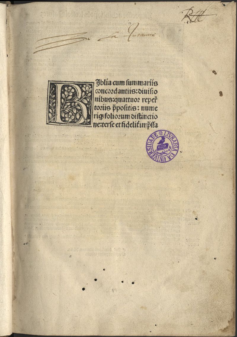 Faltam as f.com a assin. a//1 e dd//10 (em branco). - Manchas de acidez, humidade e de picos insectos. - Notas mss. - Inic. cap. e caldeiroes a azul e vermelho. - Enc. em pele com super-libros da Livraria da Universidade, lombada grav. a ferros dourados.