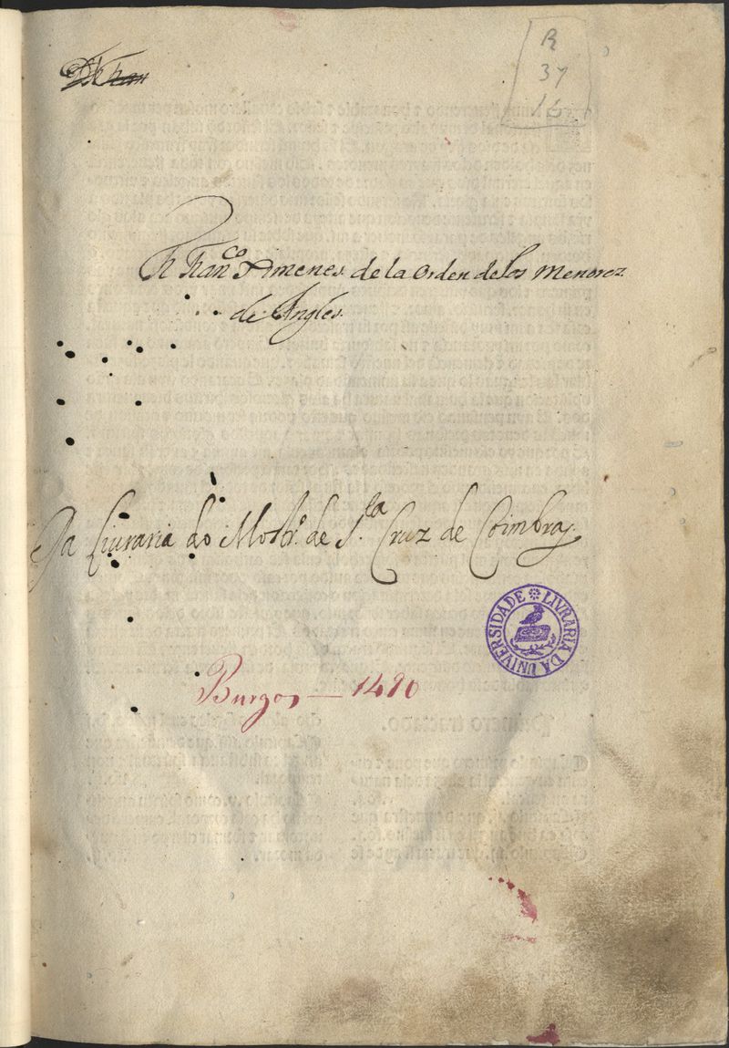 Falta a f. com a assin. S//6 (em branco?). - Aparado. - Manchas de humidade, manuseamento e picos de insectos. - Pert.: "Livraria do Mosteiro de Santa Cruz de Coimbra". - Enc. em pele grav. a ferros secos e lombada grav. a ferros dourados.