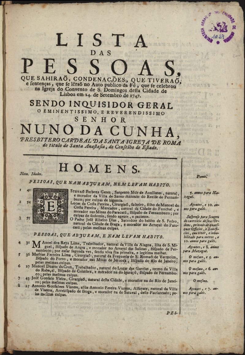 Lista das pessoas que saíram, condenações que tiveram e sentenças que se leram, no Auto público da Fé, que se celebrou na Igreja do convento de São Domingos desta cidade de Lisboa em 24 de Setembro de 1747..