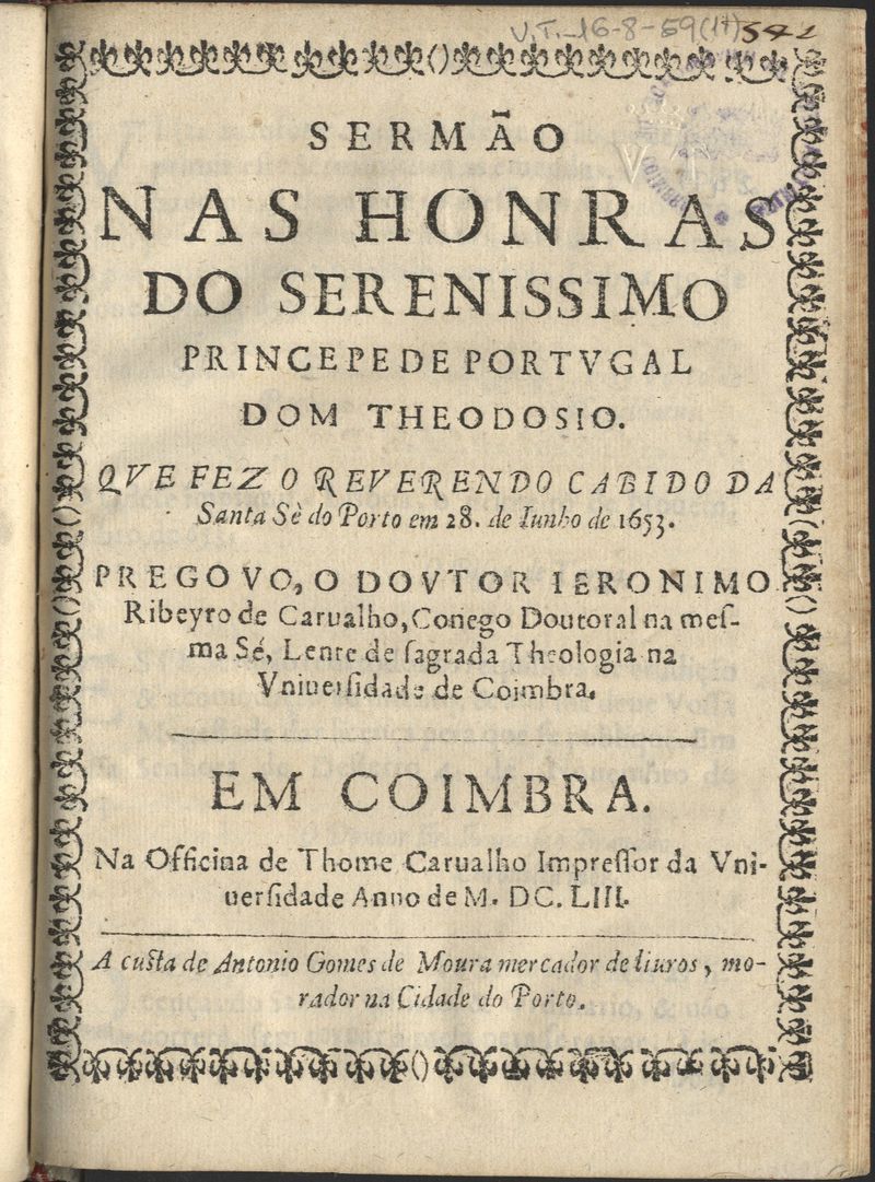 Sermão nas honras do ... Principe de Portugal Dom Theodosio que fez o reverendo cabido da Santa Sé do Porto em 28 de Iunho de 1653