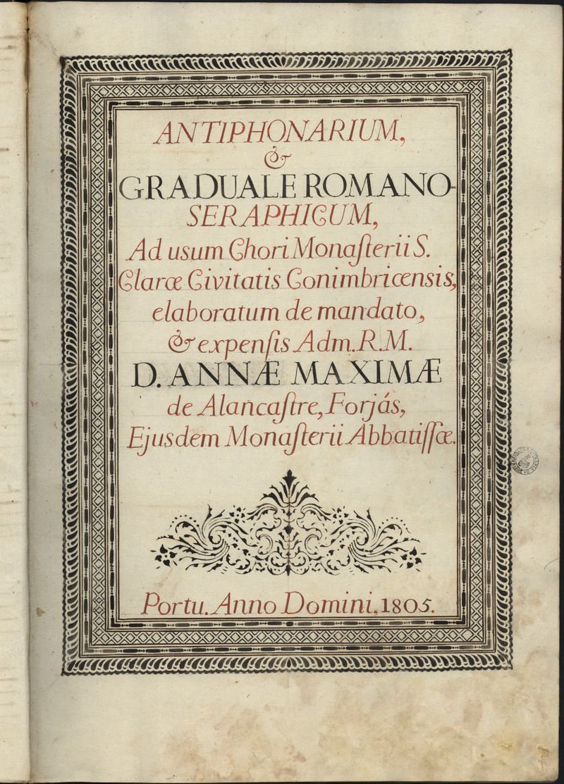 Antiphonarium et graduale romano seraphicum, ad usum chori Monasterii S. Clarae Civitatis Conimbricensis, elaboratum de mandato, et expensis Adm. R. M. D. Annae Maximae de Alancastre, Forjás, ejusdem Monasterii Albatissae... Portu, Anno Domini 1805