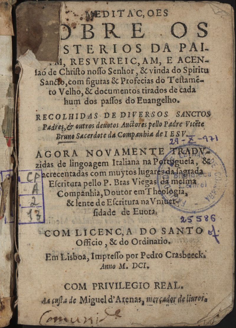 Meditações sobre os mysterios da paixam, resurreiçam, e acensão de Christo nosso Senhor, e vinda Spiritu Sancto ... recolhidas de diversos sanctos Padres