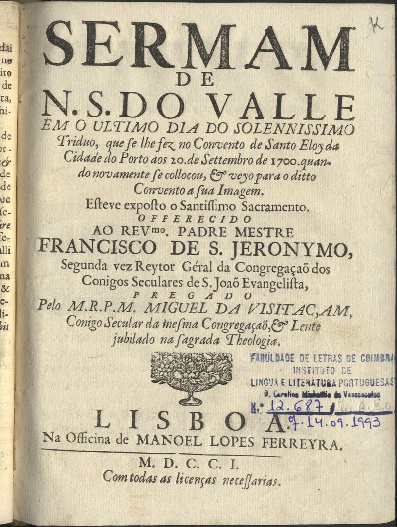 Lisboa : Na officina de Manoel Lopes Ferreyra, 1701