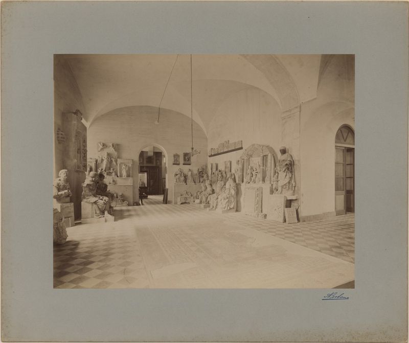 A fotografia contém estatuária e um mosaico de Conimbriga.