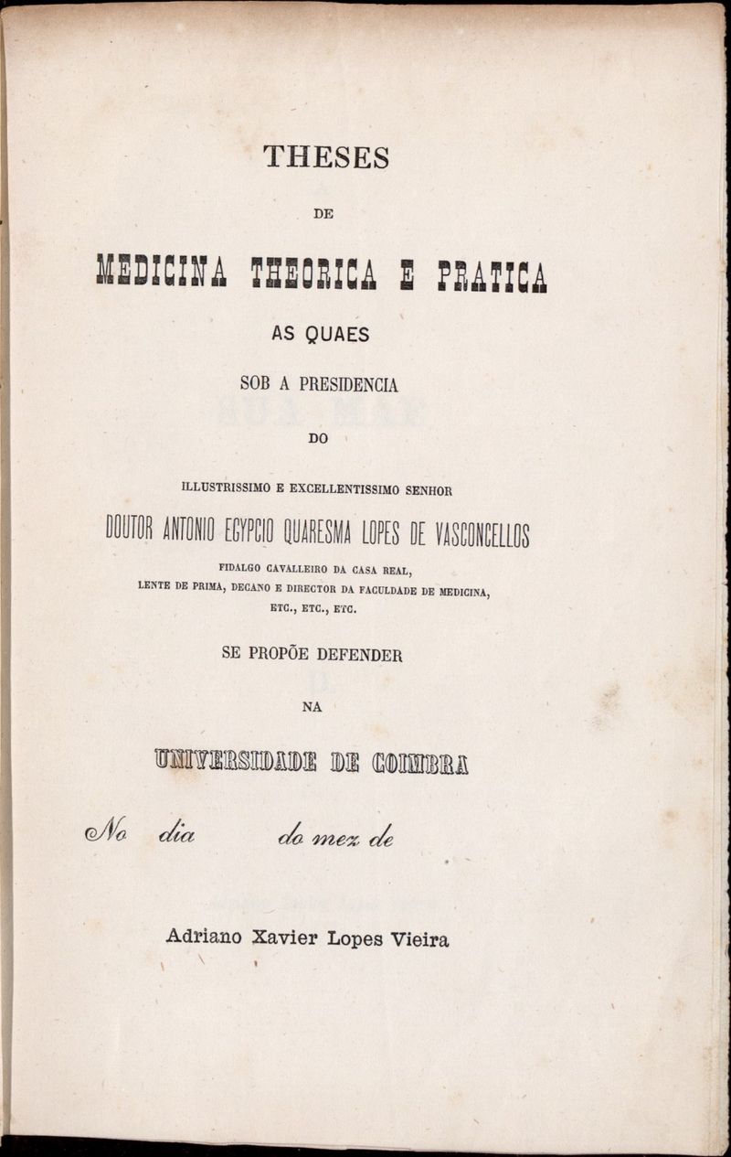 Theses de medicina theorica e pratica as quais sob a presidencia do illustrissimo e excellentissimo senhor Doutor Antonio Egypcio Quaresma Lopes de Vasconcellos...se propõe defender na Universidade de Coimbra...Adriano Xavier Lopes Vieira