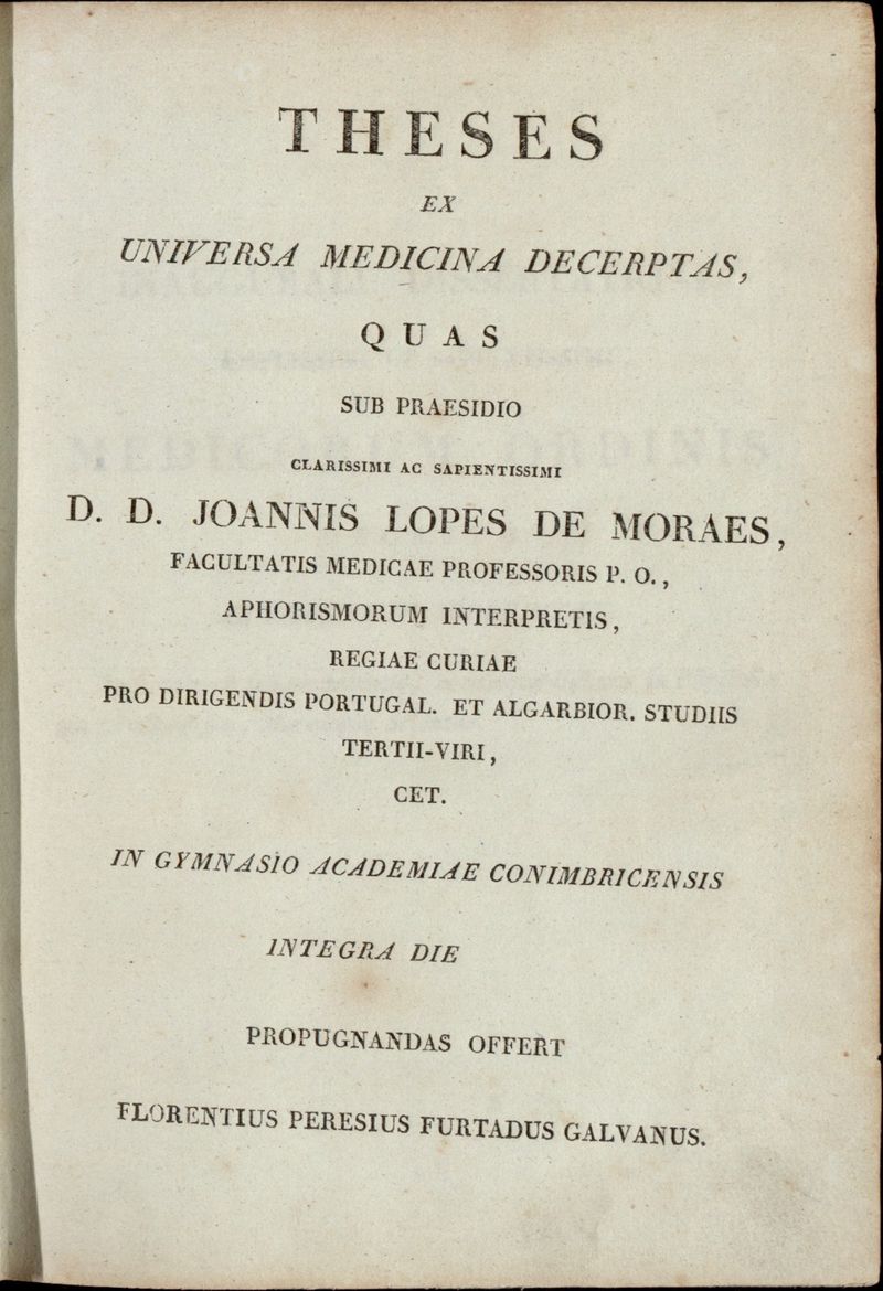 Theses ex universa medicina decerptas, quas sub praesidio clarissimi ac sapientissimi D. D. Joannis Lopes de Morais...in gymnasio Academiae Conimbricensis ...Florentius Peresius Furtados Galvanus