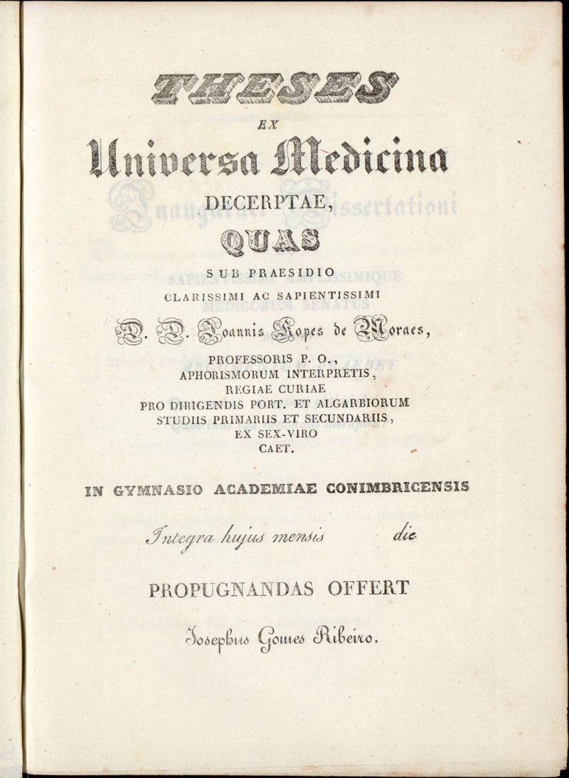 Theses ex universa medicina decerptae, quas sub praesidio clarissimi ac sapientissimi D. D. Joannis Lopes de Moraes...in gymnasio Academiae Conimbricensis...propugnandas offert Josephus Gomes Ribeiro