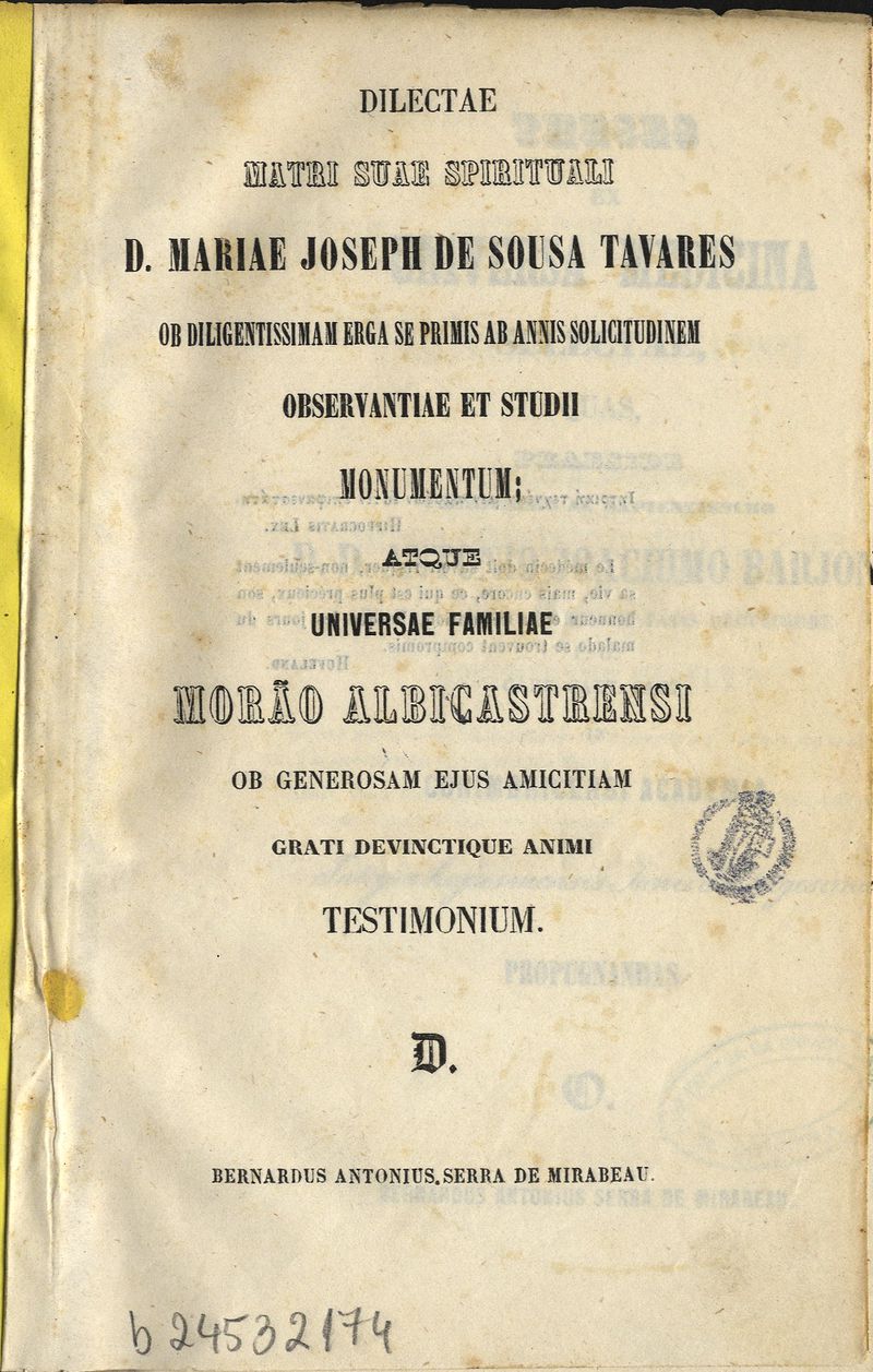 Theses ex universa medicina selectae, quas, praeside clarissimo ac sapientissimo D. D. Antonio Joachimo Barjona...in Conimbricensi Academia integra hujus mensis Junii die trigesima propugnadas...Bernardus Antonius Serra de Mirabeau