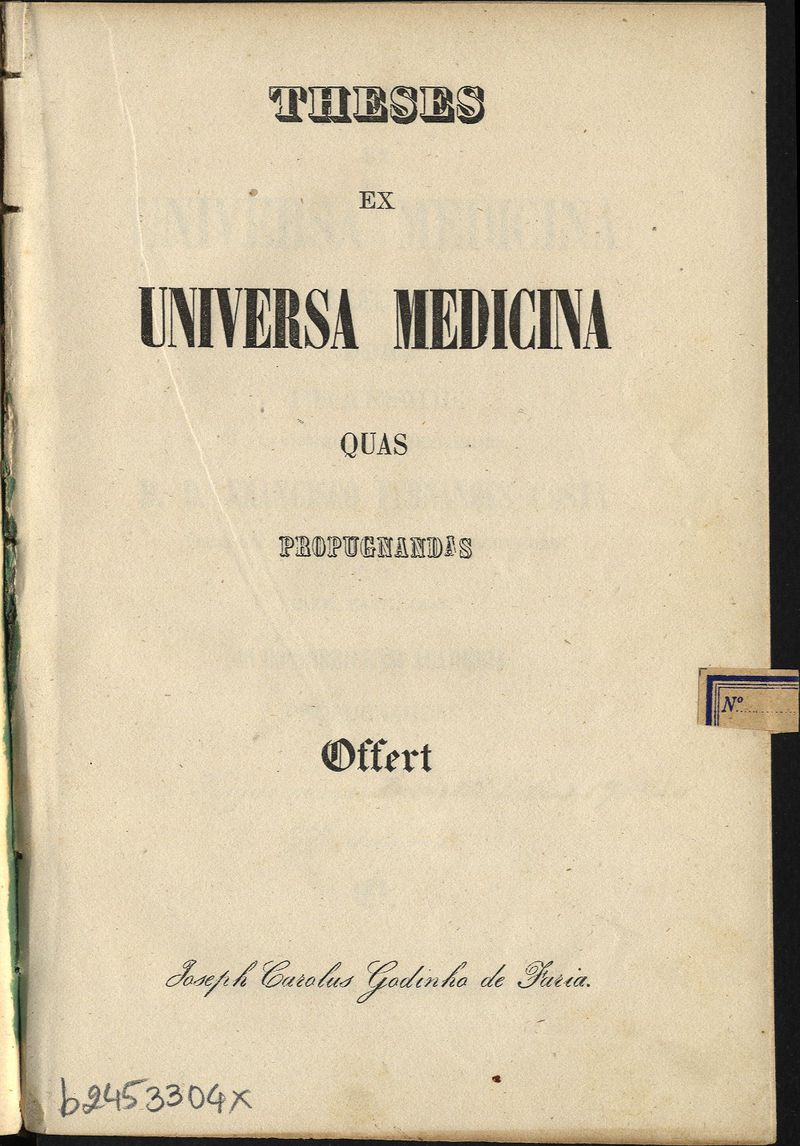 Theses ex universa medicina selectae quas praeside clarissimo ac sapientissimo D. D. Francisco Fernandes Costa...in Conimbricensi Academia propugnandas hujus mensis Martii diebus 19 et 20...Joseph Carolus Godinho de Faria