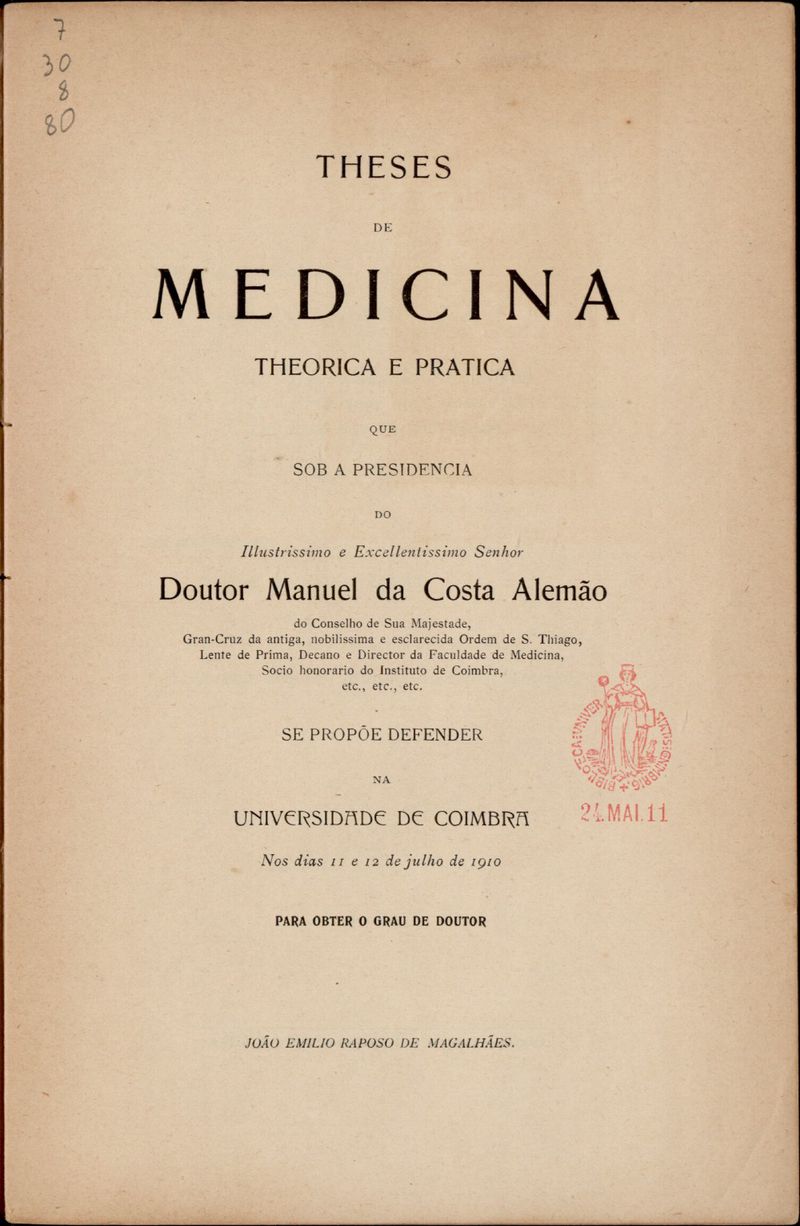 Theses de Medicina theorica e pratica que sob a presidencia do... Doutor Manuel da Costa Alemão se propõe defender na Universidade de Coimbra nos dias 11 e 12 de julho de 1910 para obter o grau de Doutor João Emilio Raposo de Magalhães