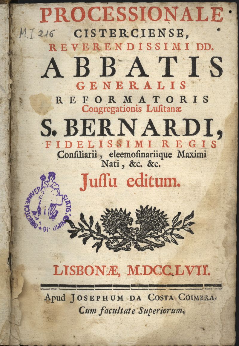 Processionale Cisterciense, reverendissimi DD. Abbatis generalis reformatoris congregationis lusitanae S. Bernardi, fidelissimi regis consiliarii, eleemosinariique Maximi Nati, &c. jussu editum