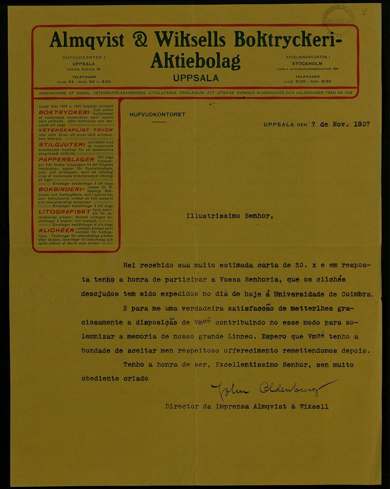 [Carta], 1907 Nov. 7, Uppsala, [a Júlio Henriques, Coimbra]