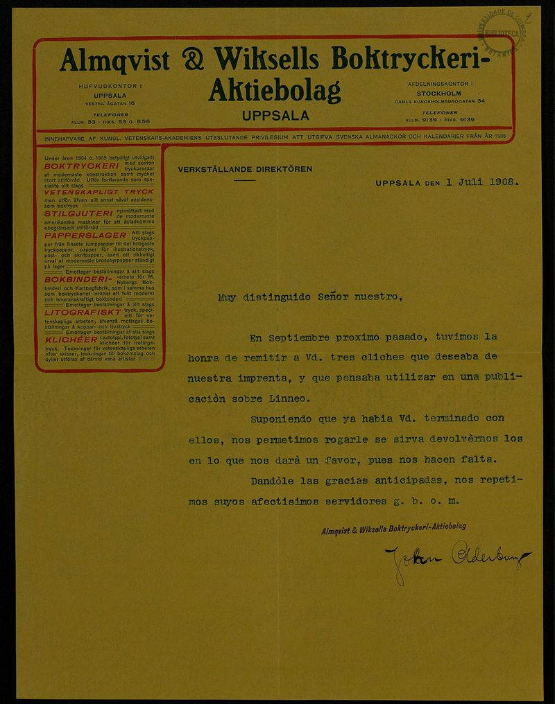 Papel timbrado de: Almqvist & Wiksells Boktryckeri-Aktiebolag.