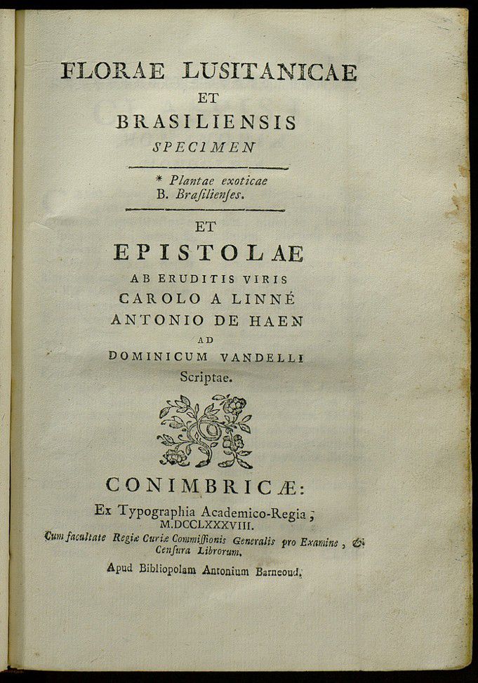 Florae Lusitanicae et Brasiliensis specimen ... et Epistolae ab eruditis viris Carolo a Linné, Antonio de Haen ad Dominicum Vandelli scriptae
