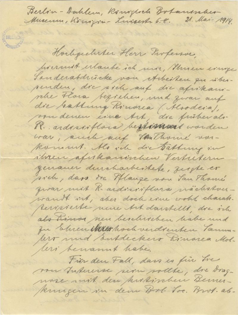 [Brief], 1914 Mai 21, Berlin-Dahlem, [an Júlio Henriques], Coimbra