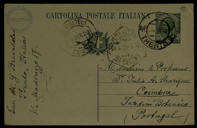 Cartolina Postale Italiana, 1920 Abr. 19, Trento, a Monsieur le Professeur Dr. Júlio A. Henriques, Coimbra