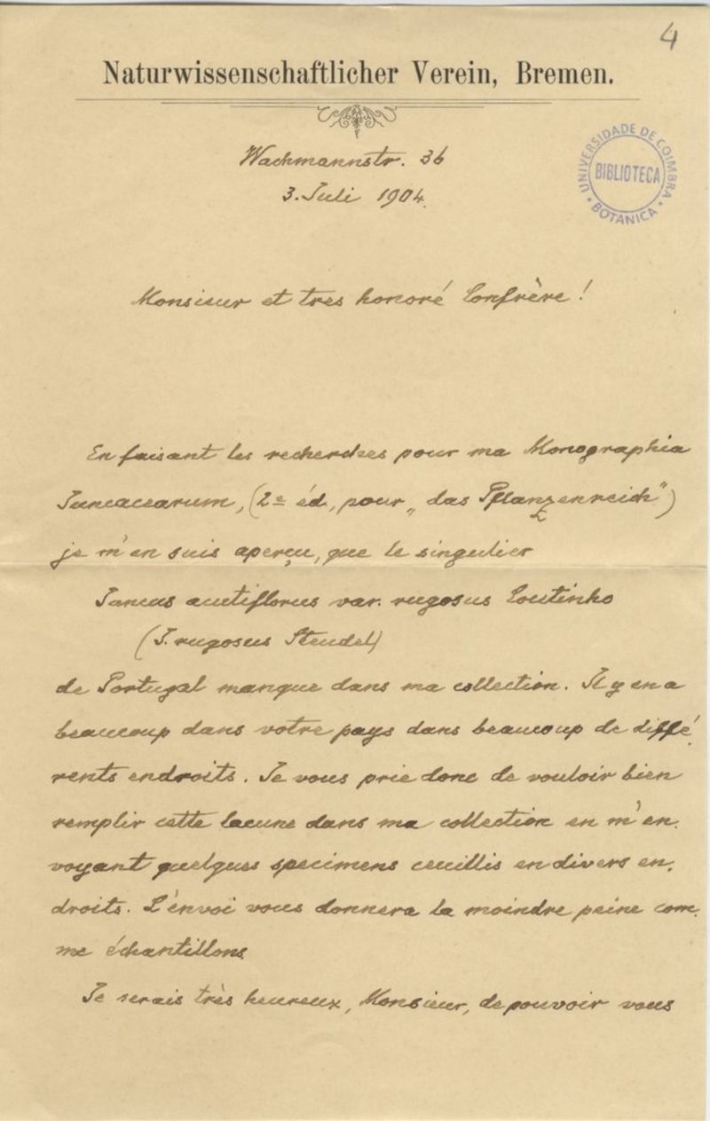 [Lettre], 1904 juil. 03, Bremen, [à Júlio Henriques, Coimbra]
