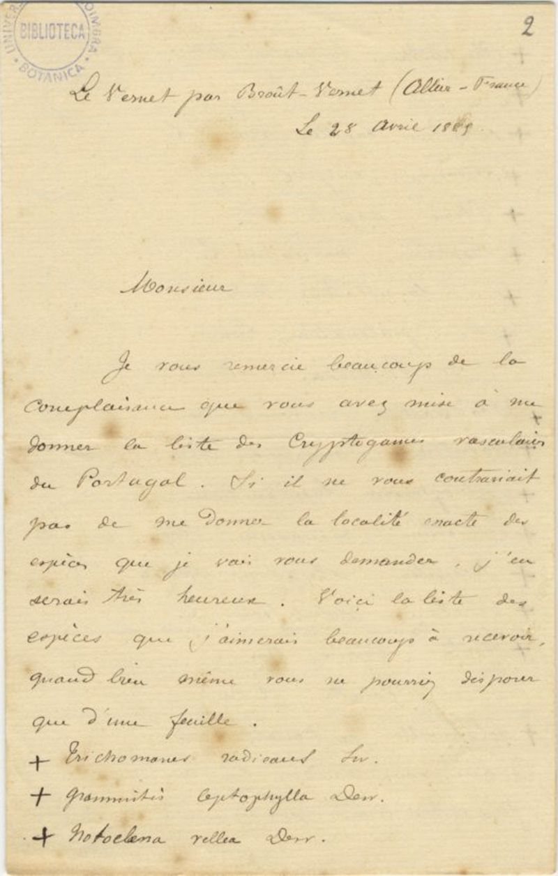 [Lettre], 1889 avr. 28, Allier [à Júlio Henriques, Coimbra]