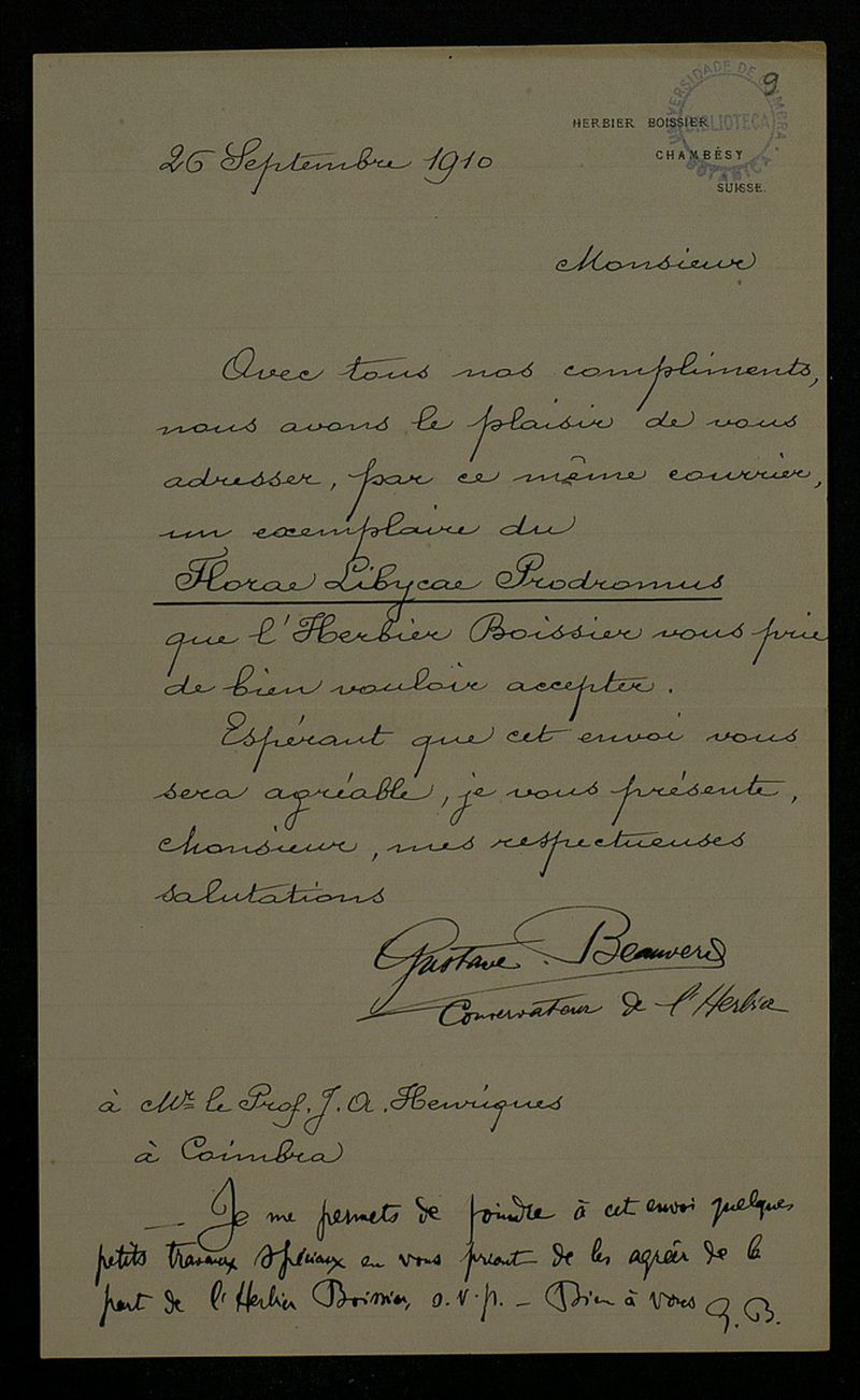 [Lettre], 1910 sept. 26, Chambésy, à Mr. le Prof. J. A. Henriques, Coimbra