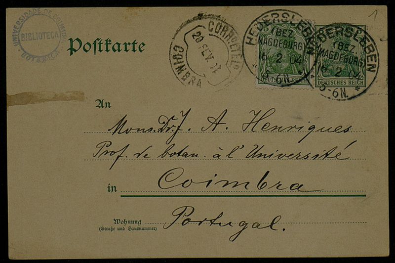 Postkarte, 1904 fév. 16, Hedersleben, an Mons. Dr. J A. Henriques, Coimbra
