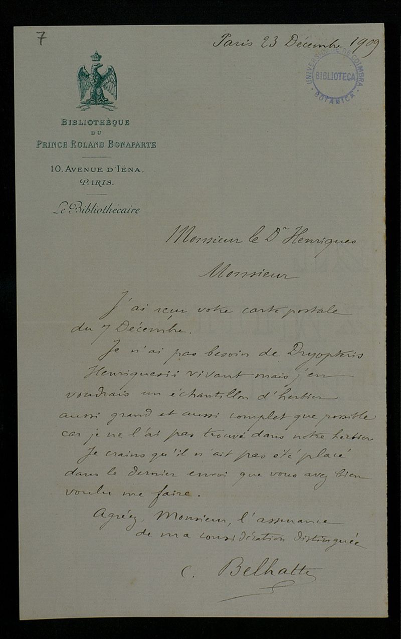 [Lettre], 1909 déc. 23, Paris, [à] Monsieur le Dr. [Júlio] Henriques, [Coimbra]
