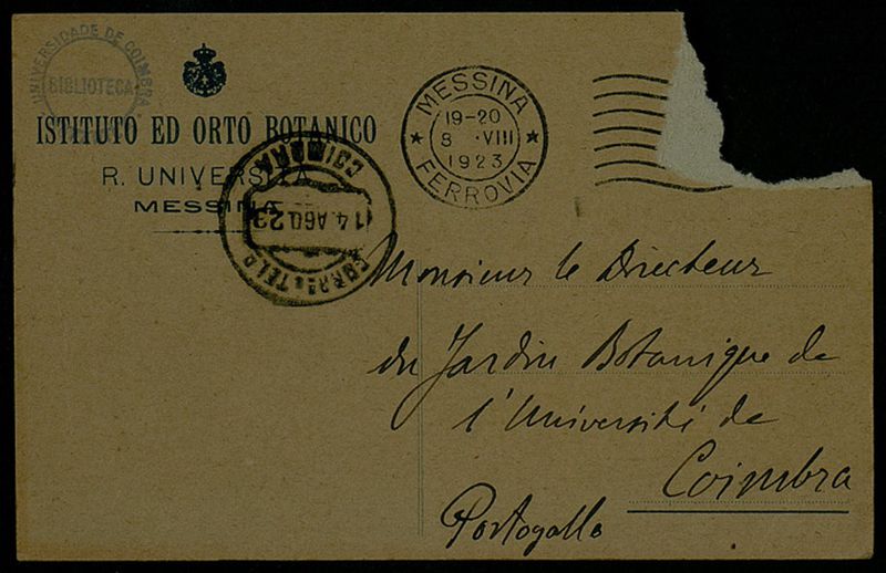 [Cartolina Postale], 1923 ago. 8, Messina, [a Júlio Henriques], Coimbra