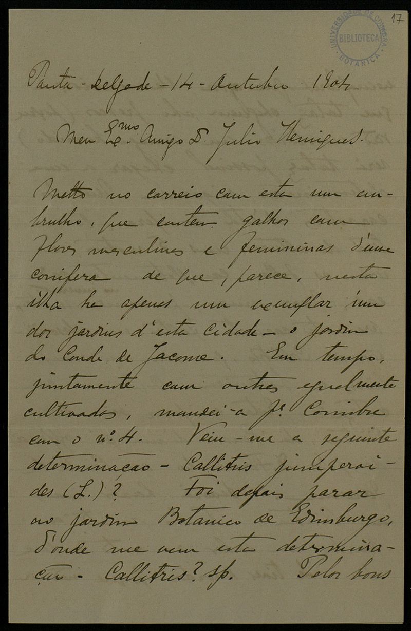 [Carta], 1904 Out. 14 , Ponta Delgada, a Dr. Júlio Henriques, [Coimbra]