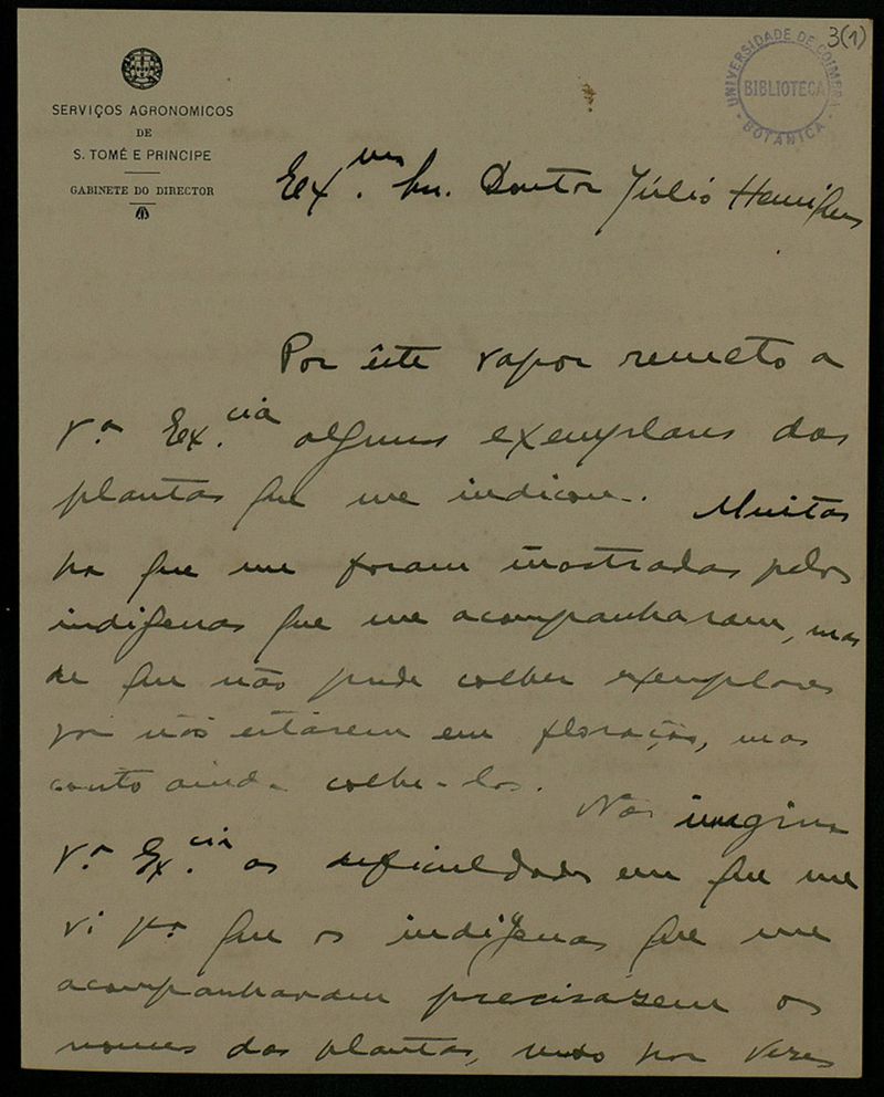 [Carta], 1916 Abr. 10, S. Tomé, [ao] Sr. Doutor Júlio Henriques, Coimbra