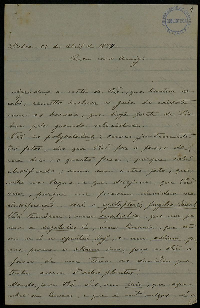 [Carta], 1879 Abr. 28, Lisboa, [a Júlio Henriques, Coimbra]