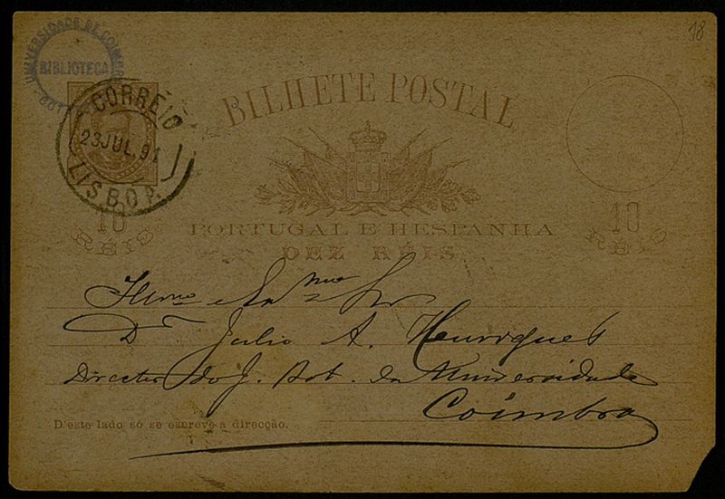 Bilhete postal, 1891 Jul. 23, Lisboa, a Júlio Henriques, Coimbra