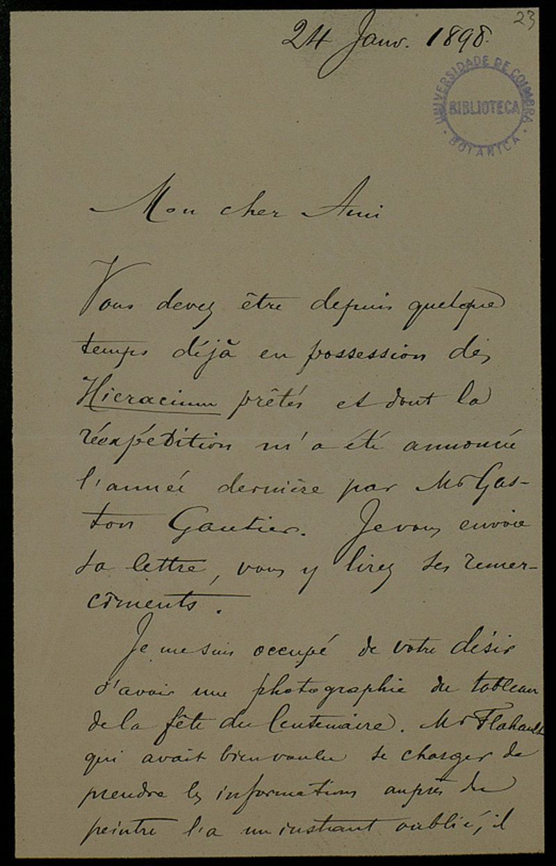 [Lettre], 1898 jan. 14, [Montpellier], [à] Júlio Henriques, Coimbra