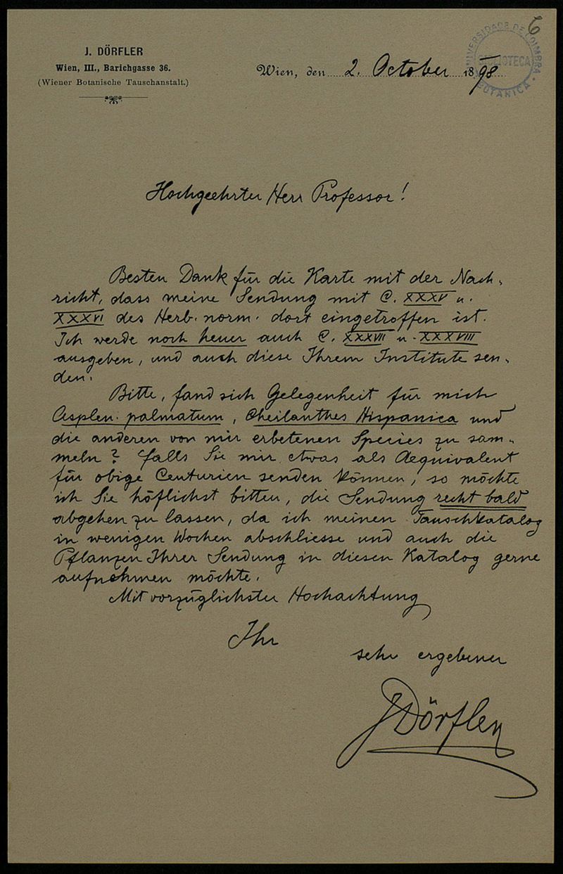 [Brief], 1898 Okt. 2, Wien, [an] Herr[n] Professor [Júlio Henriques, Coimbra]