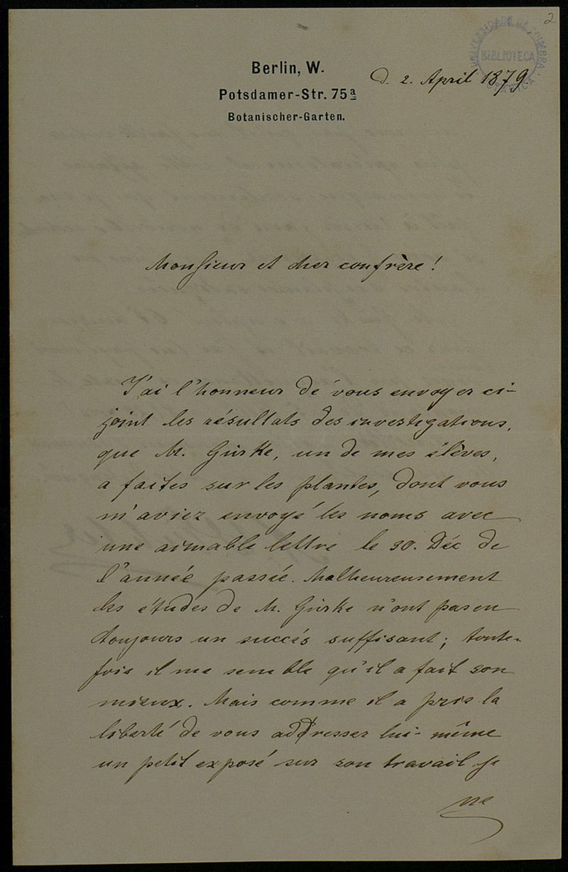 [Lettre], 1879 avr. 2, Berlin, [à] Monsieur [Júlio Henriques, Coimbra]