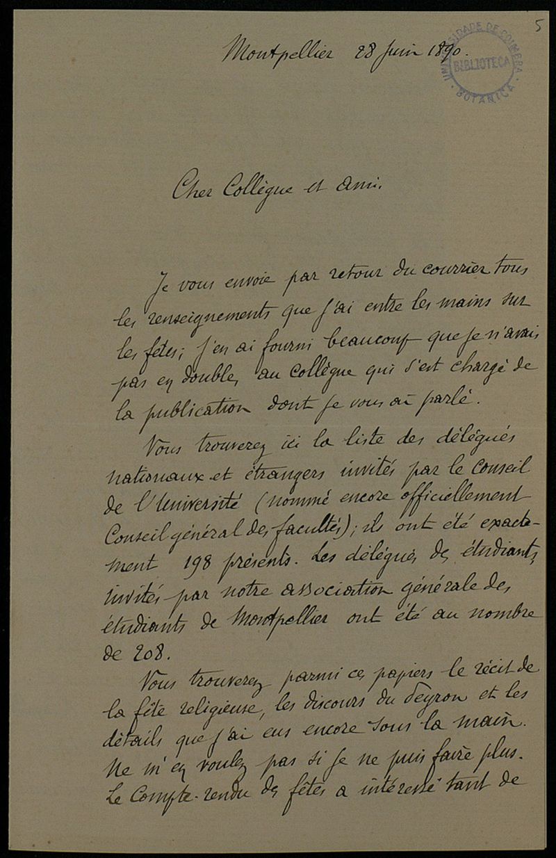 [Lettre], 1890 juin 28, Montpellier, [à Júlio Henriques, Coimbra]