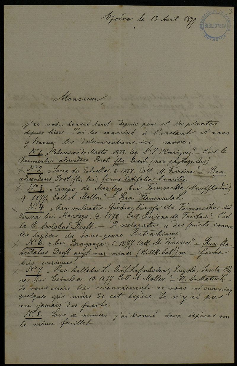 [Lettre], 1879 avr. 13, Opočno, [à Júlio Henriques, Coimbra]