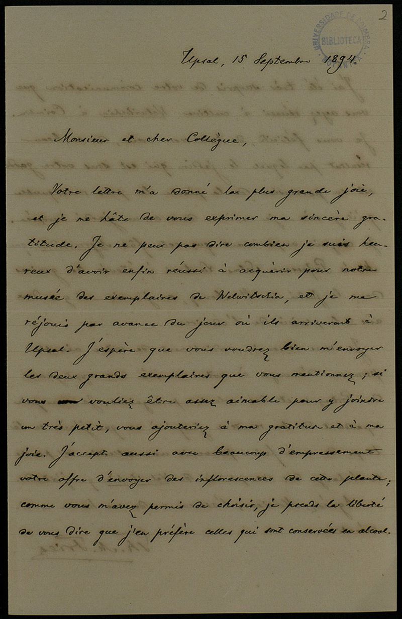 [Lettre], 1894 sept 15, Upsal, [à] Monsieur [Júlio Henriques, Coimbra]